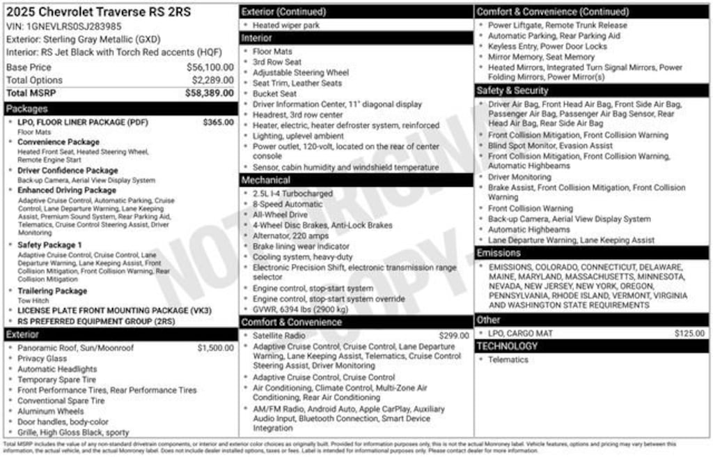 Schumacher Chevrolet of Boonton is very proud to offer this charming 2025 Chevrolet Traverse RS in Sterling Gray Metallic Beautifully equipped with Floor Liner Package (LPO) (1st & 2nd Row All-Weather Floor Liners (LPO) and 3rd Row All-Weather Floor Liner (LPO)), Preferred Equipment Group 2RS, AWD, 12 Speakers, 3 Years SiriusXM, 3rd row seats: split-bench, 4-Wheel Disc Brakes, 6-Way Power Front Passenger Seat Adjuster, 8-Way Power Driver Seat Adjuster, ABS brakes, Air Conditioning, Alloy wheels, AM/FM radio: SiriusXM with 360L, Apple CarPlay/Android Auto, Auto High-beam Headlights, Auto tilt-away steering wheel, Auto-dimming door mirrors, Automatic temperature control, Bose Premium 12-Speaker Audio System Feature, Brake assist, Bumpers: body-color, Cargo Mat, Child-Seat-Sensing Airbag, Compass, Delay-off headlights, Driver 4-Way Power Lumbar Seat Adjuster, Driver door bin, Driver vanity mirror, Dual front impact airbags, Dual front side impact airbags, Electronic Stability Control, Emergency communication system: OnStar, Exterior Parking Camera Rear, Four wheel independent suspension, Front anti-roll bar, Front Bucket Seats, Front Center Armrest, Front dual zone A/C, Front Passenger 4-Way Power Lumbar Seat Adjuster, Front reading lights, Fully automatic headlights, Garage door transmitter, Heated door mirrors, Heated front seats, Heated rear seats, Heated steering wheel, Illuminated entry, Low tire pressure warning, Memory seat, Navigation System, Occupant sensing airbag, Outside temperature display, Overhead airbag, Overhead console, Panic alarm, Passenger door bin, Passenger vanity mirror, Perforated Leather-Appointed Seat Trim, Power door mirrors, Power driver seat, Power Dual Glass Panoramic Sliding Sunroof, Power Liftgate, Power passenger seat, Power steering, Power windows, Radio data system, Radio: Audio System w/17.7 Diagonal Display, Rain sensing wipers, Rear air conditioning, Rear anti-roll bar, Rear reading lights, Rear window defroster, Rear window wiper, Remote keyless entry, Security system, SiriusXM w/360L Trial Subscription, Speed control, Speed-sensing steering, Spoiler, Sport steering wheel, Steering wheel memory, Steering wheel mounted audio controls, Tachometer, Telescoping steering wheel, Tilt steering wheel, Traction control, Trip computer, Turn signal indicator mirrors, Variably intermittent wipers, Ventilated front seats, Voltmeter, and Wheels: 22 High Gloss Black Painted Aluminum!