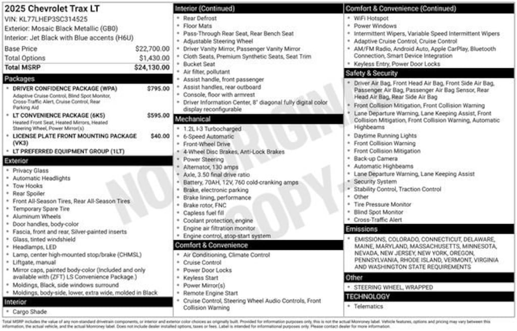 Schumacher Chevrolet of Boonton is pumped up to offer this charming 2025 Chevrolet Trax LT in Mosaic Black Metallic Beautifully equipped with Driver Confidence Package (Adaptive Cruise Control, Lane Change Alert w/Side Blind Zone Alert, Rear Cross-Traffic Alert, and Rear Park Assist), License Plate Front Mounting Package, LT Convenience Package (Front Doors Keyless Open, Heated Driver & Front Passenger Seats, Heated Power-Adjustable Outside Mirrors, Heated Steering Wheel, and Wrapped Steering Wheel), Preferred Equipment Group 1LT, 2-Way Adjustable Front Head Restraints, 3.50 Final Drive Axle Ratio, 4-Way Manual Front Passenger Seat Adjuster, 4-Wheel Disc Brakes, 6 Speakers, 6-Speaker Audio System Feature, 6-Way Manual Driver Seat Adjuster, ABS brakes, Air Conditioning, Alloy wheels, AM/FM radio: SiriusXM, Auto High-beam Headlights, Automatic temperature control, Brake assist, Bumpers: body-color, Cloth/Evotex Seat Trim, Compass, Delay-off headlights, Driver door bin, Driver vanity mirror, Dual front impact airbags, Dual front side impact airbags, Electronic Stability Control, Emergency communication system: OnStar One Essentials, Exterior Parking Camera Rear, Front anti-roll bar, Front Bucket Seats, Front Center Armrest, Front reading lights, Front wheel independent suspension, Fully automatic headlights, Illuminated entry, Low tire pressure warning, Occupant sensing airbag, Outside temperature display, Overhead airbag, Overhead console, Panic alarm, Passenger door bin, Passenger vanity mirror, Power door mirrors, Power steering, Power windows, Premium audio system: Chevrolet Infotainment 3, Radio data system, Radio: AM/FM Stereo Audio System, Rear window defroster, Rear window wiper, Remote keyless entry, Security system, SiriusXM Trial Subscription, Speed control, Split folding rear seat, Spoiler, Steering wheel mounted audio controls, Tachometer, Telescoping steering wheel, Tilt steering wheel, Traction control, Trip computer, Variably intermittent wipers, and Wheels: 17 Gray-Painted Machined Aluminum!