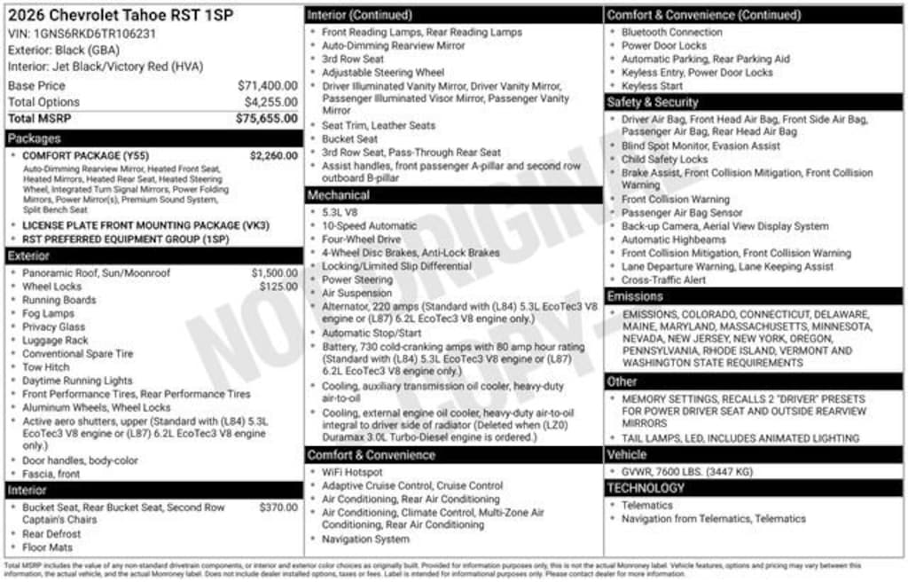 Schumacher Chevrolet of Boonton is very proud to offer this fantastic 2026 Chevrolet Tahoe RST in Black Beautifully equipped with Comfort Package (2nd Row Pwr Release 60/40 Split-Folding Bench Seat, 3rd Row 60/40 Power-Folding Split-Bench Seat, Bose 10-Speaker Centerpoint Surround Audio Sys Ft, Heated 2nd Row Outboard Seats, Heated Steering Wheel, LED Headlamps w/LED Daytime Running Lamps, LED Tail Lamps, Memory Settings, and Outside Heated Power-Adjustable Mirrors), License Plate Front Mounting Package, Preferred Equipment Group 1SP (1st & 2nd Row Color-Keyed Carpeted Floor Mats, 3-Spoke Wrapped Steering Wheel, 3rd Row Manual 60/40 Split-Folding Bench Seats, Auto-Dimming Inside Rear-View Mirror, Bright Front & Rear Door Sill Plates, Color-Keyed Carpeting Floor Covering, Dual Exhaust System, Floor Console w/Storage Area, Front LED Fog Lamps, Frontal Driver & Outboard Passenger Airbags, Interior Camera, Key Card, Memory Settings for Driver, Rear Power Liftgate, Remote Start, RST Exterior Features, SiriusXM w/360L Trial Subscription, Universal Home Remote, USB Ports, and Wireless Phone Charging), 4WD, Jet Black/Victory Red Leather, 2-Way Power Driver Lumbar Seat Adjuster, 2-Way Power Front Passenger Lumbar Seat Adjuster, 3.23 Rear Axle Ratio, 3rd row seats: split-bench, 4-Wheel Disc Brakes, 6 Speakers, 6-Speaker Audio System Feature, 8-Way Power Driver Seat Adjuster, 8-Way Power Front Passenger Seat Adjuster, ABS brakes, Air Conditioning, Alloy wheels, AM/FM radio: SiriusXM with 360L, Apple CarPlay/Android Auto, Auto High-beam Headlights, Auto-dimming Rear-View mirror, Automatic temperature control, Brake assist, Bumpers: body-color, Compass, Delay-off headlights, Driver door bin, Driver vanity mirror, Dual front impact airbags, Dual front side impact airbags, Dual-Pane Power Panoramic Sunroof, Electronic Stability Control, Emergency communication system: OnStar and Chevrolet connected services capable, Exterior Parking Camera Rear, Four wheel independent suspension, Front anti-roll bar, Front Bucket Seats, Front Center Armrest, Front dual zone A/C, Front fog lights, Front reading lights, Fully automatic headlights, Garage door transmitter, Heated door mirrors, Heated Driver & Front Passenger Seats, Heated front seats, Illuminated entry, Low tire pressure warning, Memory seat, Navigation system: Google built-in compatibility (select service plan required, terms and limitations apply), Occupant sensing airbag, Outside temperature display, Overhead airbag, Overhead console, Panic alarm, Passenger door bin, Passenger vanity mirror, Perforated Leather Seat Trim, Power door mirrors, Power driver seat, Power Liftgate, Power passenger seat, Power Release 2nd Row Bucket Seats, Power steering, Power windows, Premium audio system: Chevrolet Infotainment 3 Premium, Premium Smooth Ride Suspension, Radio data system, Radio: 17.7 Diagonal Advanced Color LCD Display, Rain sensing wipers, Rear air conditioning, Rear anti-roll bar, Rear reading lights, Rear seat center armrest, Rear window defroster, Rear window wiper, Remote keyless entry, Security system, Set of 4 Wheel Locks (LPO), Speed control, Speed-sensing steering, Split folding rear seat, Spoiler, Steering wheel mounted audio controls, Tachometer, Telescoping steering wheel, Tilt steering wheel, Traction control, Trip computer, Variably intermittent wipers, Voltmeter, and Wheels: 22 x 9 Bright Machined!