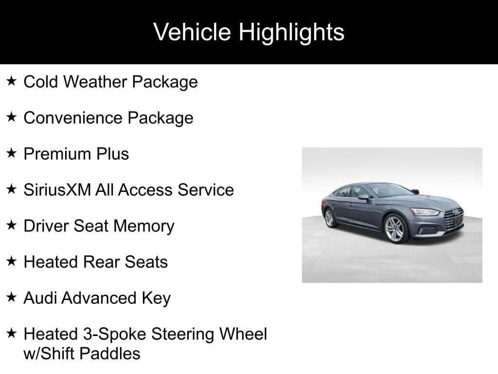Elevate your driving experience with this meticulously maintained 2019 Audi A5 Sportback Premium Plus quattro. Boasting a sleek Gray exterior and a refined interior, this vehicle is a testament to Audi's commitment to engineering excellence.