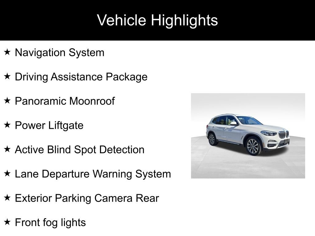 X3 xDrive30i, 4D Sport Utility, 2.0L I4 TwinPower Turbo, 8-Speed Automatic, AWD, Alpine White, Canberra Beige/Black Artificial Leather, Active Blind Spot Detection, Active Driving Assistant, Advanced Real-Time Traffic Information, Apple CarPlay Compatibility, Driving Assistance Package, Exterior Parking Camera Rear, Front fog lights, Fully automatic headlights, Heated Front Seats, Lane Departure Warning System, Navigation System, Panoramic Moonroof, Power Liftgate, Remote Services.