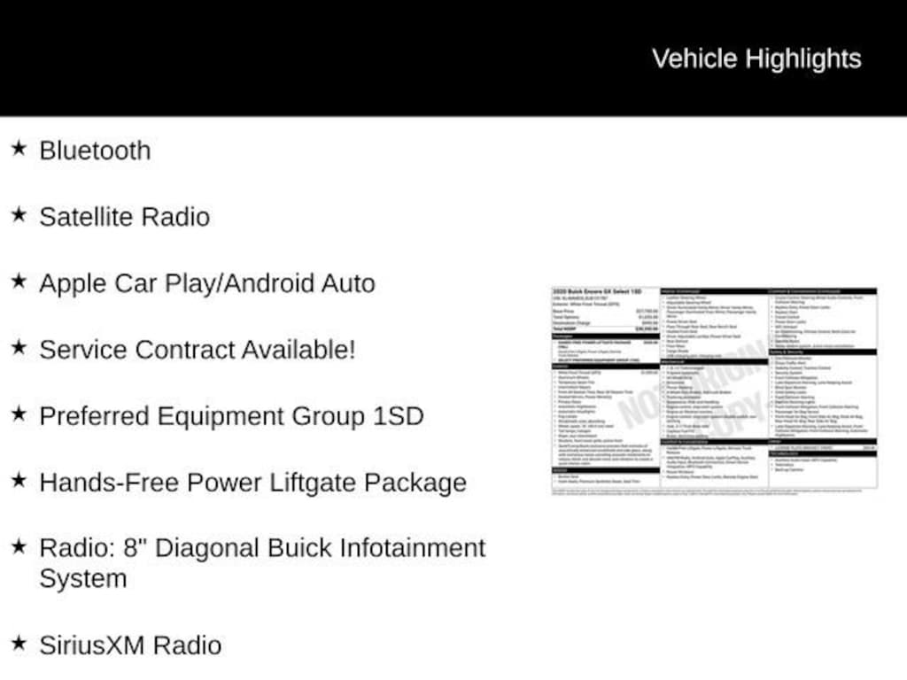 Discover the perfect blend of style, technology, and capability with this exceptional 2020 Buick Encore GX Select. Boasting a sleek White Frost Tricoat exterior and a well-appointed interior, this compact SUV is ready to elevate your driving experience.