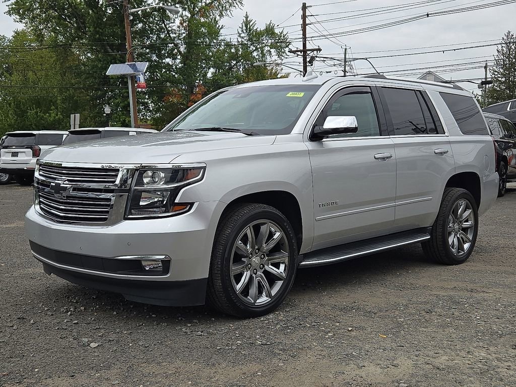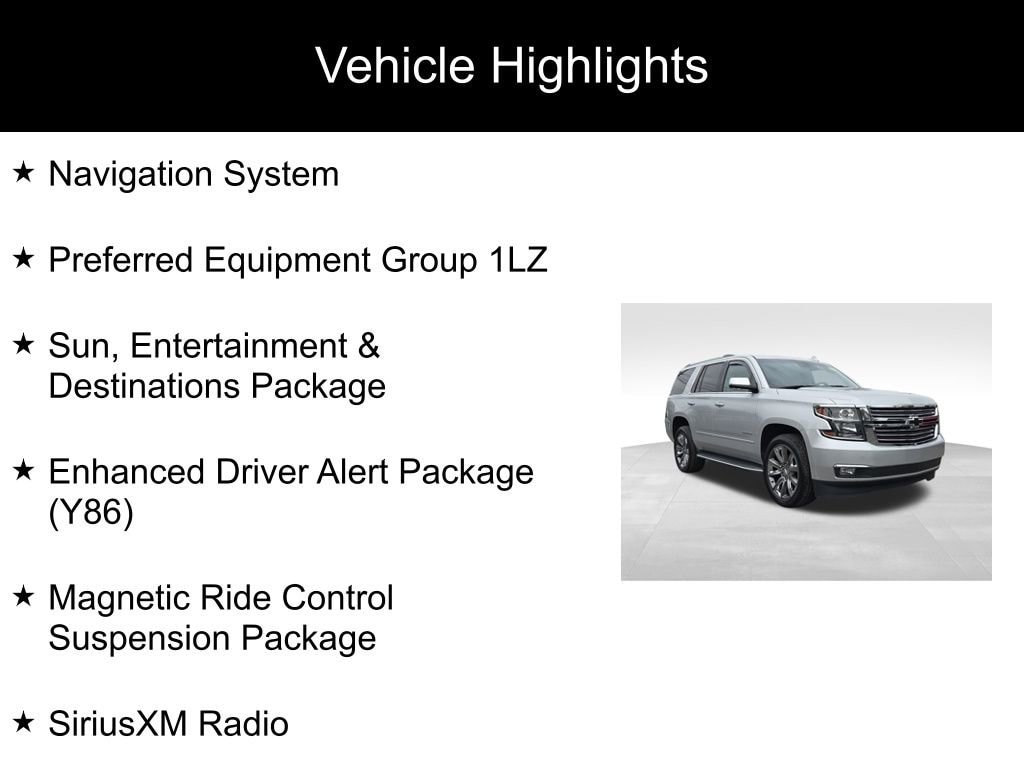 Tahoe Premier, 4D Sport Utility, EcoTec3 5.3L V8, 6-Speed Automatic Electronic with Overdrive, 4WD, Silver Ice Metallic, Jet Black Leather, 1st & 2nd Row Color-Keyed Carpeted Floor Mats, 3rd Row 60/40 Power Fold Split-Bench, 4-Wheel Antilock Disc Brakes w/Brake Assist, 5 12-Volt Auxiliary Power Outlets, Auto-Dimming Inside Rear-View Mirror, Black Assist Steps w/Chrome Accent Strip, Bose Centerpoint Premium 10-Speaker Surround Sound, Cargo Net, Color-Keyed Carpeting Floor Covering, Driver Inboard & Front Passenger Airbags, Electronic Cruise Control w/Set & Resume Speed, Enhanced Driver Alert Package (Y86), Exterior Parking Camera Rear, Floor Console, Fog Lamps, Forward Collision Alert, Front & Rear Park Assist, Front Heated Reclining Bucket Seats, Front Passenger 6-Way Power Seat Adjuster, Hands Free Power Liftgate, Heated & Ventilated Driver & Front Passenger Seats, Heated 2nd Row Seats, Heated Leather Wrapped Steering Wheel, High-Intensity Discharge Headlights, IntelliBeam Headlamps, Lane Change Alert w/Side Blind Zone Alert, Lane Keep Assist w/Lane Departure Warning, Low Speed Forward Automatic Braking, Magnetic Ride Control Suspension Package, Memory Settings, Navigation System, Passive Entry System, Power Liftgate, Power Release 2nd Row Bucket Seats, Power Sunroof, Power Tilt & Telescopic Steering Column, Power-Adjustable Accelerator & Brake Pedals, Power-Folding Heated Outside Mirrors, Preferred Equipment Group 1LZ, Push Button Keyless Start, Rear Cross Traffic Alert, Rear Seat Blu-Ray/DVD Entertainment System, Remote Vehicle Start, Roof-Mounted Luggage Rack Side Rails, SiriusXM NavTraffic, SiriusXM Radio, Sun, Entertainment & Destinations Package, Universal Home Remote, Ventilated front seats, Wireless Charging.