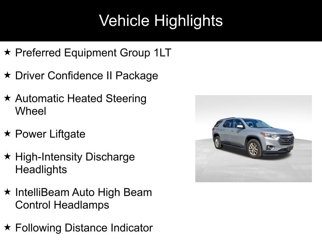 Traverse LT 1LT, 4D Sport Utility, 3.6L V6 SIDI VVT, 9-Speed Automatic, AWD, Silver Ice Metallic, Jet Black Cloth, 7-Passenger Seating (2-2-3 Seating Configuration), Automatic Emergency Braking, Automatic Heated Steering Wheel, Driver Confidence II Package, Following Distance Indicator, Forward Collision Alert, Front Pedestrian Braking, Heated front seats, High-Intensity Discharge Headlights, IntelliBeam Auto High Beam Control Headlamps, Lane Keep Assist w/Lane Departure Warning, Power Liftgate, Preferred Equipment Group 1LT.