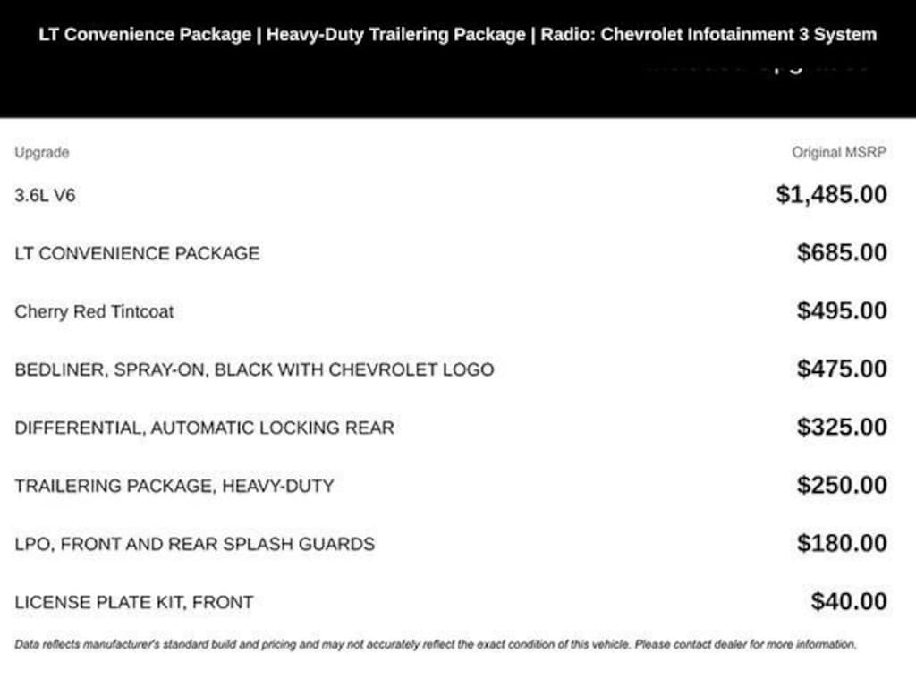 Bluetooth, Satellite Radio, Back Up Camera, Apple Car Play/Android Auto, Service Contract Available!, 4WD, 4-Wheel Disc Brakes, 6-Speaker Audio System Feature, ABS brakes, Alloy wheels, Apple CarPlay/Android Auto, Black Spray-On Bedliner w/Chevrolet Logo, Cloth Seat Trim, Driver 6-Way Power Seat Adjuster, Electronic Stability Control, Enhanced Driver Instrument Information Display, Exterior Parking Camera Rear, Front Fog Lamps, Fully automatic headlights, Heavy-Duty Trailering Package, LT Convenience Package, Manual Rear-Sliding Window, Power driver seat, Preferred Equipment Group 4LT, Premium audio system: Chevrolet Infotainment 3, Radio: Chevrolet Infotainment 3 System, Rear Vision Camera, Rear-Window Electric Defogger, Remote keyless entry, Remote Vehicle Starter System, Security system, SiriusXM Radio, Tow/Haul Mode, Traction control.