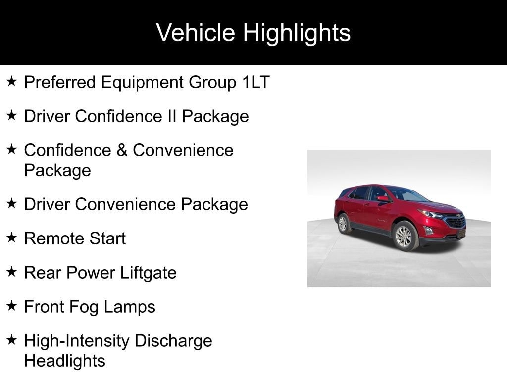 Equinox LT, 4D Sport Utility, 1.5L DOHC, 6-Speed Automatic Electronic with Overdrive, AWD, Cajun Red Tintcoat, Jet Black Cloth, Apple CarPlay/Android Auto, Confidence & Convenience Package, Driver Confidence II Package, Driver Convenience Package, Front Fog Lamps, Heated Driver & Front Passenger Seats, High-Intensity Discharge Headlights, Lane Change Alert w/Side Blind Zone Alert, Preferred Equipment Group 1LT, Rear Cross Traffic Alert, Rear Park Assist w/Audible Warning, Rear Power Liftgate, Remote Start.