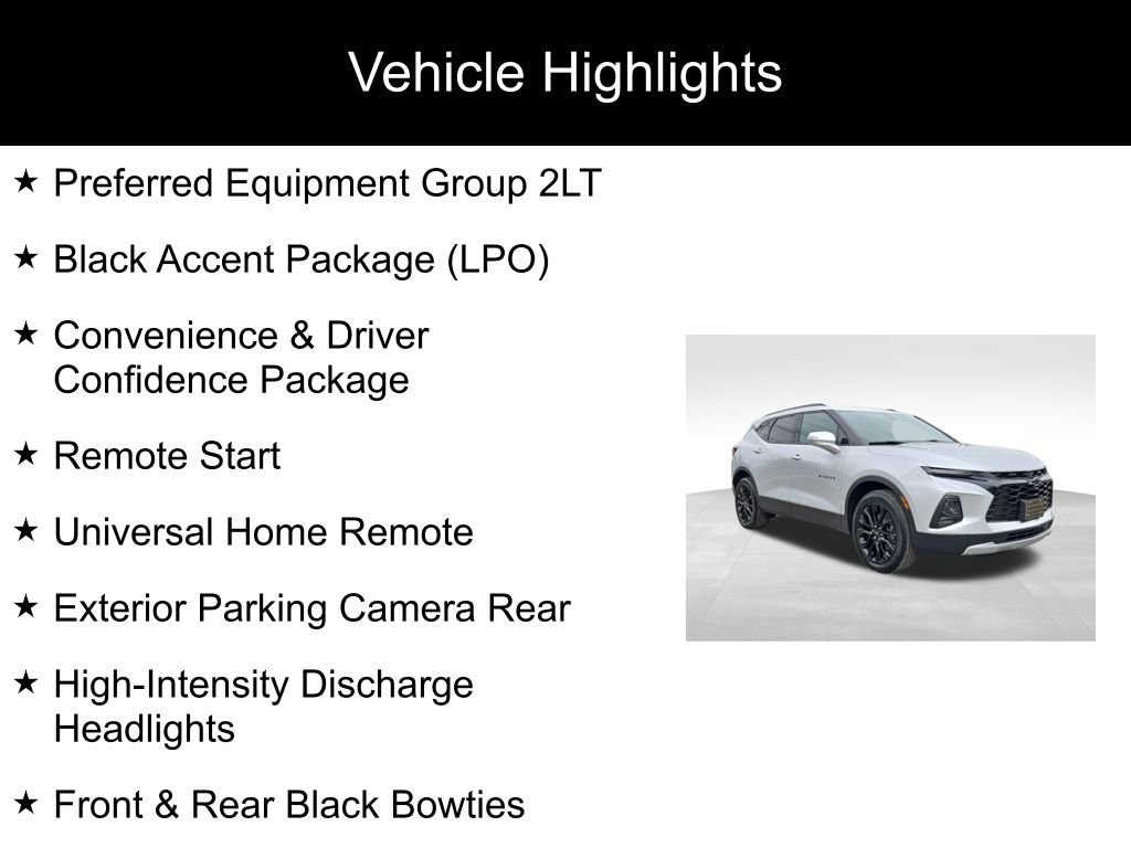 Blazer LT, 4D Sport Utility, 2.0L Turbocharged, 9-Speed Automatic with Overdrive, AWD, Silver Ice Metallic, Jet Black Cloth, Apple CarPlay/Android Auto, Black Accent Package (LPO), Black Mesh Grille w/Black Header Bar (LPO), Black Roof Rails, Convenience & Driver Confidence Package, Exterior Parking Camera Rear, Front & Rear Black Bowties, Gloss Black Emblem Kit (LPO), Heated Driver & Front Passenger Seats, High-Intensity Discharge Headlights, Inside Rear-View Auto-Dimming Mirror, Lane Change Alert w/Side Blind Zone Alert, Outside Heated Power-Adjustable Body-Color Mirrors, Preferred Equipment Group 2LT, Rear Cross Traffic Alert, Rear Park Assist w/Audible Warning, Rear Power Programmable Liftgate, Remote Start, Universal Home Remote.
