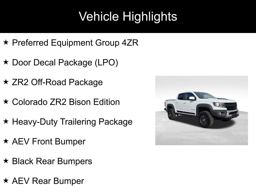 Colorado ZR2, V6, 8-Speed Automatic, 4WD, Summit White, Black Leather, AEV Embroidered Headrests, AEV Front Bumper, AEV Rear Bumper, Apple CarPlay/Android Auto, Black Rear Bumpers, Black Spray-On Bedliner w/Chevrolet Logo, Colorado ZR2 Bison Edition, Door Decal Package (LPO), Driver-Selectable Full-Locking Front Differential, Driver-Selectable Full-Locking Rear Differential, Exterior Parking Camera Rear, Front Contoured Floor Mats, Front Fog Lamps, Fully automatic headlights, Heavy-Duty Trailering Package, Hitch Guidance, Integrated Trailer Brake Controller, Leather-Appointed Seat Trim, Preferred Equipment Group 4ZR, Rear Contoured Floor Mats, Tow/Haul Mode, Wheel Moldings, Wheels: 17 x 8 Dark Graphite Aluminum, ZR2 Off-Road Package.Summit White 2022 Chevrolet Colorado ZR2 4D Crew Cab 4WD 8-Speed Automatic V6Don't hesitate...a deal like this doesn't last forever! Reach out to us at 1-855-958-3198 to speak with one of our customer friendly product specialists to schedule the test drive of YOUR next vehicle!