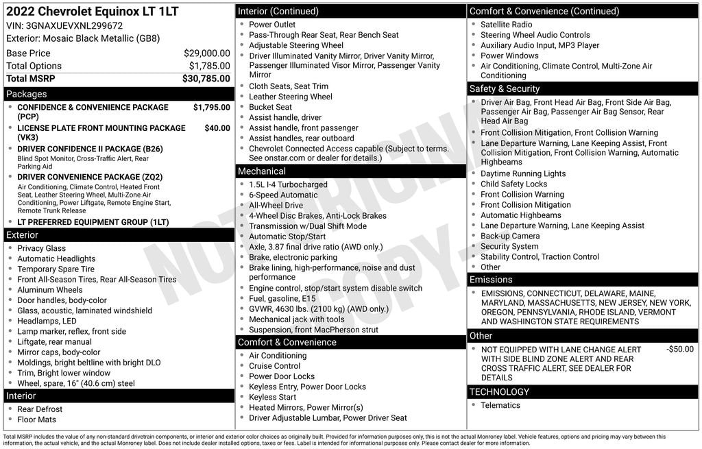 AWD.Mosaic Black Metallic 2022 Chevrolet Equinox LT 4D Sport Utility AWD 6-Speed Automatic Electronic with Overdrive 1.5L DOHC 25/30 City/Highway MPGFinal price includes all Factory Incentives.