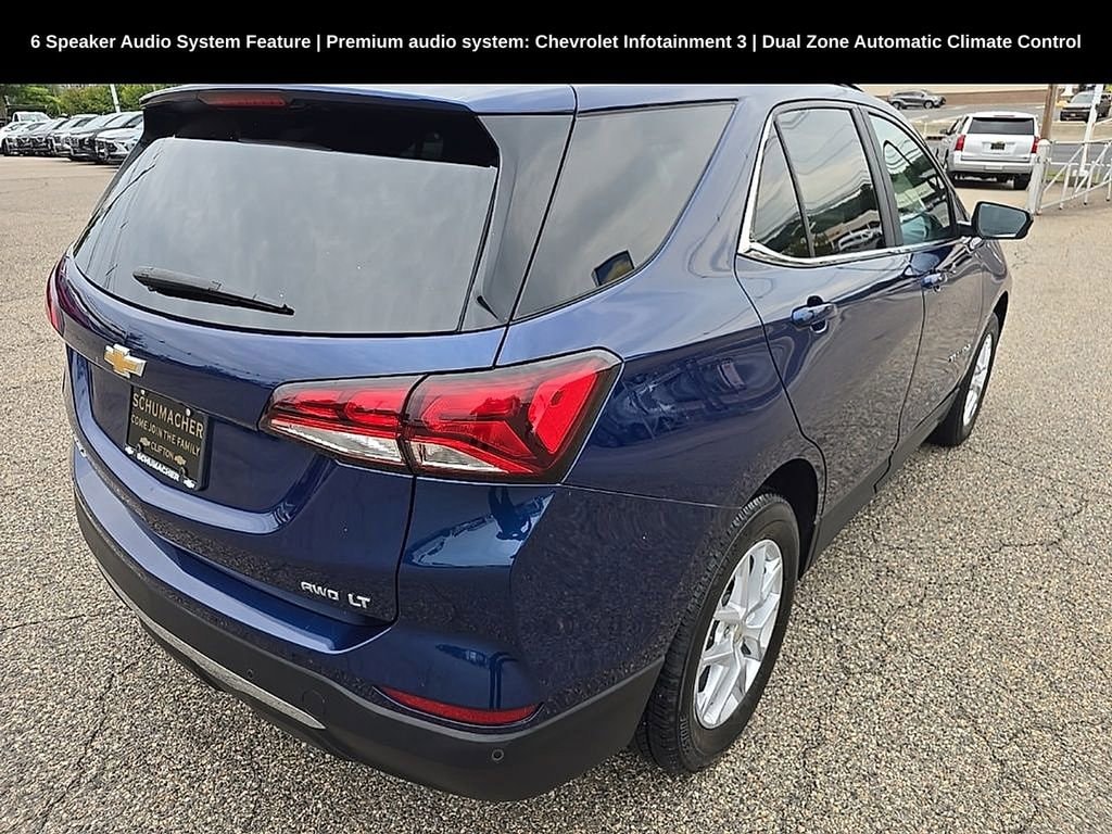 Schumacher Chevrolet of Clifton is proud to offer this stunning 2022 Chevrolet Equinox LT in Blue Glow Metallic Beautifully equipped with Confidence & Convenience Package, Driver Confidence II Package (Front & Rear Park Assist, Lane Change Alert w/Side Blind Zone Alert, and Rear Cross Traffic Alert), Driver Convenience Package (3-Spoke Leather-Wrapped Steering Wheel, Dual Zone Automatic Climate Control, Heated Driver & Front Passenger Seats, Rear Power Liftgate, and Remote Start), Preferred Equipment Group 1LT, 2 Rear USB Charging-Only Ports, 2 USB Ports & Auxiliary Input Jack, 2-Way Power Driver Lumbar Control Seat Adjuster, 6 Speaker Audio System Feature, 8-Way Power Driver Seat Adjuster, Alloy wheels, Bluetooth® For Phone, Delay-off headlights, Heated door mirrors, Occupant sensing airbag, Power door mirrors, Power driver seat, Power Sunroof, Power windows, Premium audio system: Chevrolet Infotainment 3, Radio: Chevrolet Infotainment 3 System w/AM/FM, Remote keyless entry, Roof-Mounted Luggage Rack Side Rails, Security system, SiriusXM Radio, Steering wheel mounted audio controls, Wireless Apple CarPlay/Wireless Android Auto, 17 Aluminum Wheels, 3.87 Final Drive Axle Ratio, 4-Wheel Disc Brakes, 6 Speakers, ABS brakes, Air Conditioning, AM/FM radio: SiriusXM, Auto High-beam Headlights, Brake assist, Bumpers: body-color, Compass, Driver door bin, Driver vanity mirror, Dual front impact airbags, Dual front side impact airbags, Electronic Stability Control, Emergency communication system: OnStar and Chevrolet connected services capable, Four wheel independent suspension, Front anti-roll bar, Front Bucket Seats, Front Center Armrest, Front Passenger 4-Way Manual Seat Adjuster, Front reading lights, Fully automatic headlights, Illuminated entry, Low tire pressure warning, Not Equipped w/Lane Change & Rear Cross Traffic Alerts, Outside temperature display, Overhead airbag, Overhead console, Panic alarm, Passenger door bin, Passenger vanity mirror, Power steering, Premium Cloth Seat Trim, Radio data system, Rear anti-roll bar, Rear reading lights, Rear seat center armrest, Rear window defroster, Rear window wiper, Speed control, Speed-sensing steering, Split folding rear seat, Spoiler, Tachometer, Telescoping steering wheel, Tilt steering wheel, Traction control, Trip computer, and Variably intermittent wipers!