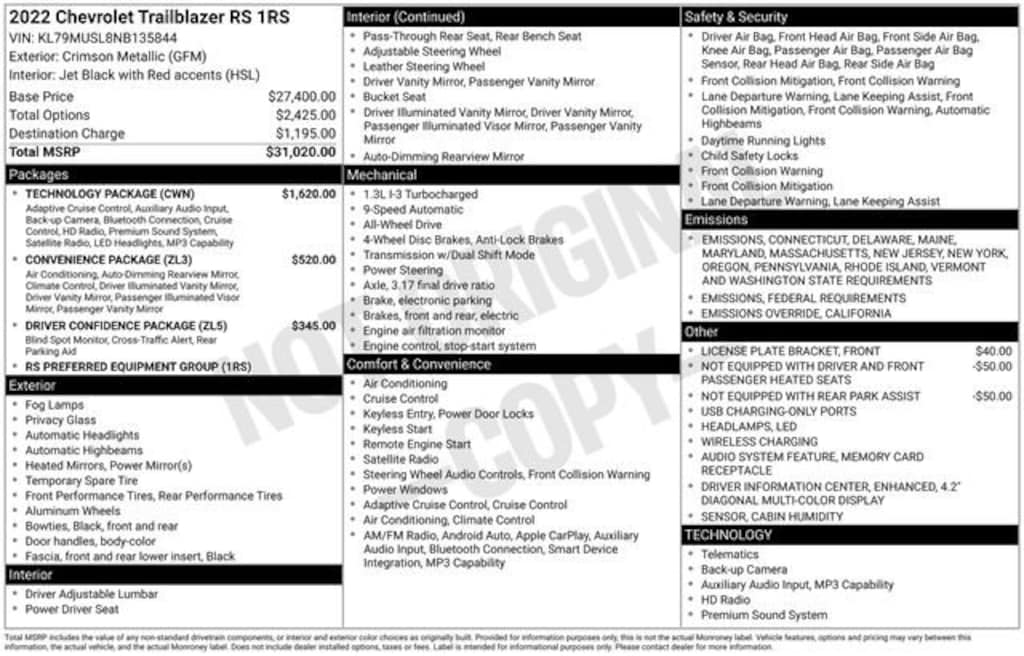 Satellite Radio, Back Up Camera, Blind Spot Monitor, Cross Traffic Alert, Apple Car Play/Android Auto, Service Contract Available!, Heated Seats, 1 Type-A & 1 Type-C USB Charging-Only Ports, 120-Volt Power Outlet, 4-Wheel Disc Brakes, 4.2 Diagonal Multi-Color Driver Info Center, 6-Speaker Audio System Feature w/Amplifier, 8 Diagonal Color Touchscreen Display, ABS brakes, Adaptive Cruise Control, Auto High-beam Headlights, Bose Premium 7-Speaker Audio System Feature, Brake assist, Convenience Package, Driver & Front Passenger Illuminated Vanity Mirrors, Driver Confidence Package, Electronic Stability Control, Exterior Parking Camera Rear, Front fog lights, Fully automatic headlights, HD Rear Vision Camera, Heated Steering Wheel, Inside Rear-View Auto-Dimming Mirror, Lane Change Alert w/Side Blind Zone Alert, LED Headlamps, Mosaic Black Metallic Two-Tone Roof, Preferred Equipment Group 1RS, Radio: Chevrolet Infotainment 3 Plus System, Radio: Chevrolet Infotainment 3 System, Rear Cross Traffic Alert, Rear Park Assist, Single-Zone Auto Climate Control Air Conditioning, SiriusXM Radio, Technology Package, Wireless Apple CarPlay/Android Auto, Wireless Charging.Crimson Metallic 2022 Chevrolet TrailBlazer RS 4D Sport Utility AWD 9-Speed Automatic 1.3L Ecotec Turbo DOHC SIDI w/VVT 26/30 City/Highway MPG