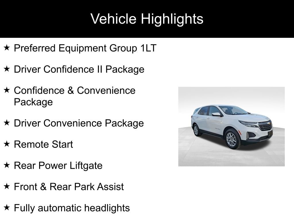 Odometer is 3050 miles below market average! Schuamcher replaced the cabin filter, air filter, and wipers; changed the oil & filter; rotated the tires.Equinox LT, 1.5L DOHC, 6-Speed Automatic Electronic with Overdrive, AWD, Summit White, Jet Black Cloth, 2-Way Power Driver Lumbar Control Seat Adjuster, Confidence & Convenience Package, Driver 8-Way Power Seat Adjuster, Driver Confidence II Package, Driver Convenience Package, Front & Rear Park Assist, Fully automatic headlights, Heated Driver & Front Passenger Seats, Preferred Equipment Group 1LT, Rear Power Liftgate, Remote Start, Wireless Apple CarPlay/Wireless Android Auto.Summit White 2023 Chevrolet Equinox LT 4D Sport Utility AWD 6-Speed Automatic Electronic with Overdrive 1.5L DOHC 24/30 City/Highway MPGDon't hesitate...a deal like this doesn't last forever! Reach out to us at 1-855-958-3198 to speak with one of our customer friendly product specialists to schedule the test drive of YOUR next vehicle!