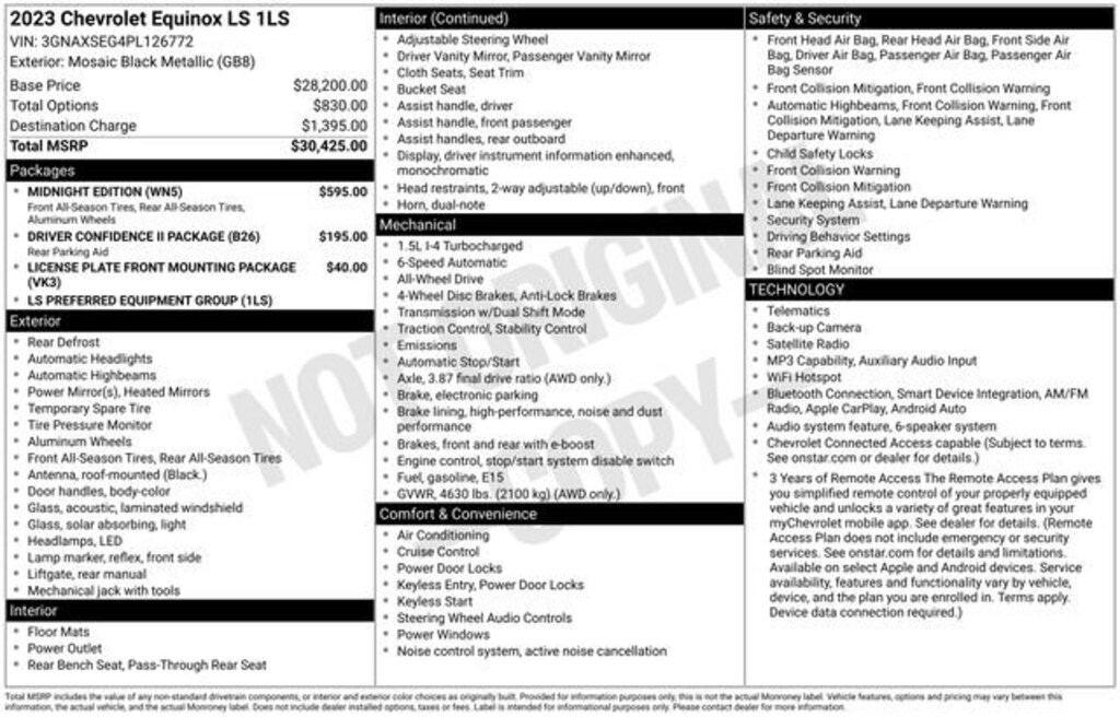 Experience the versatility and style of the 2023 Chevrolet Equinox LS. This SUV offers a compelling blend of practicality, technology, and sophisticated design that makes it an excellent choice for today's active lifestyles.- Apple CarPlay/Android Auto- Back Up Camera- Bluetooth- Driver Confidence II Package- Midnight EditionBeneath the striking Midnight Edition styling, this Equinox LS is powered by a 1.5L DOHC engine paired with a 6-Speed Automatic Electronic transmission and All-Wheel Drive. With an EPA-estimated 24 city/30 highway MPG, you'll enjoy efficient performance for your daily commute or weekend adventures.Climb inside and you'll be greeted by a wealth of premium features, including a 6-speaker audio system, Chevrolet Infotainment 3 system with AM/FM and SiriusXM radio, and wireless Apple CarPlay/Android Auto connectivity. Dual-zone climate control, a leather-wrapped steering wheel, and power windows ensure your comfort. Safety is also a priority, with Lane Change Alert, Rear Cross Traffic Alert, and Rear Park Assist providing added peace of mind.The Equinox LS boasts a spacious and versatile interior, with 60/40 split-folding rear seats that allow you to easily accommodate passengers and cargo. With 63.9 cubic feet of maximum cargo space, you'll have ample room for all your gear, whether it's sports equipment, camping supplies, or that special purchase.Stylish, capable, and packed with the latest technology, the 2023 Chevrolet Equinox LS is the perfect companion for your active lifestyle. Experience the difference for yourself with a test drive at our dealership today.We're confident you'll be impressed by the Equinox LS's combination of performance, features, and value. Our team of knowledgeable sales professionals is here to answer any questions you may have and help you find the perfect vehicle to meet your needs. Visit us soon and let us show you why the Equinox LS should be your next SUV.