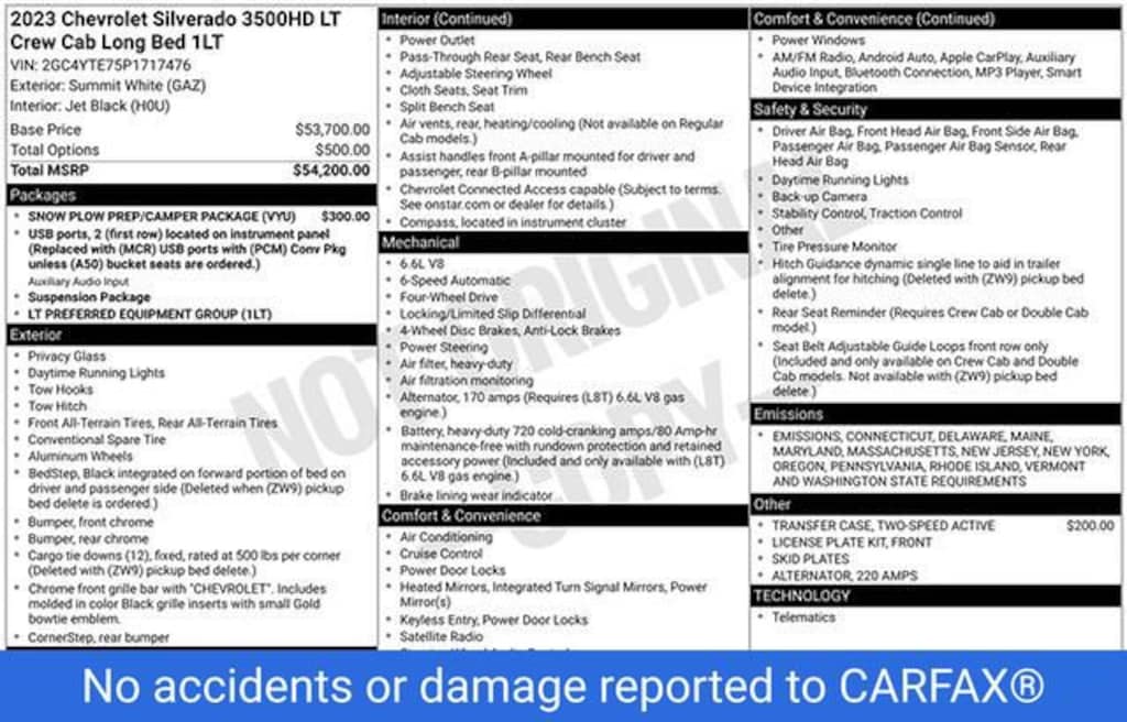 Bluetooth, Satellite Radio, Back Up Camera, Apple Car Play/Android Auto, 6-Speed Automatic, 4WD, Black Cloth, 170 Amp Alternator, 2 USB Ports (First Row), 2-Speed Electronic Shift Transfer Case, 220 Amp Alternator, 4-Wheel Disc Brakes, 4.2 Diagonal Color Display Driver Info Center, 6-Speaker Audio System Feature, ABS brakes, Apple CarPlay/Android Auto, Black Mirror Caps, Bluetooth® For Phone, Brake assist, Chevrolet Connected Access Capable, Chrome Front Grille Bar w/Molded Grille Inserts, Color-Keyed Carpeting Floor Covering, Compass Located In Instrument Cluster, Deep-Tinted Glass, Electronic Stability Control, EZ Lift Power Lock & Release Tailgate, Front Rubberized Vinyl Floor Mats, Halogen Reflector Headlamps, Integrated Trailer Brake Controller, Manual Tilt Wheel Steering Column, OnStar & Chevrolet Connected Services Capable, Outside Power-Adjustable Mirrors, Power Door Locks, Power Front Windows w/Driver Express Up/Down, Power Front Windows w/Passenger Express Down, Power Rear Windows w/Express Down, Preferred Equipment Group 1LT, Radio: Chevrolet Infotainment 3 System, Rear 60/40 Folding Bench Seat (Folds Up), Rear Rubberized-Vinyl Floor Mats, Rear step bumper, Rear Vision Camera, Remote Keyless Entry, SiriusXM Radio, Snow Plow Prep/Camper Package, Standard Tailgate, Steering Wheel Audio Controls, Steering Wheel Mounted Electronic Cruise Control, Suspension Package, Wi-Fi Hotspot Capable, Wrapped Steering Wheel.Summit White 2023 Chevrolet Silverado 3500HD LT 4D Crew Cab 4WD 6-Speed Automatic 6.6L V8