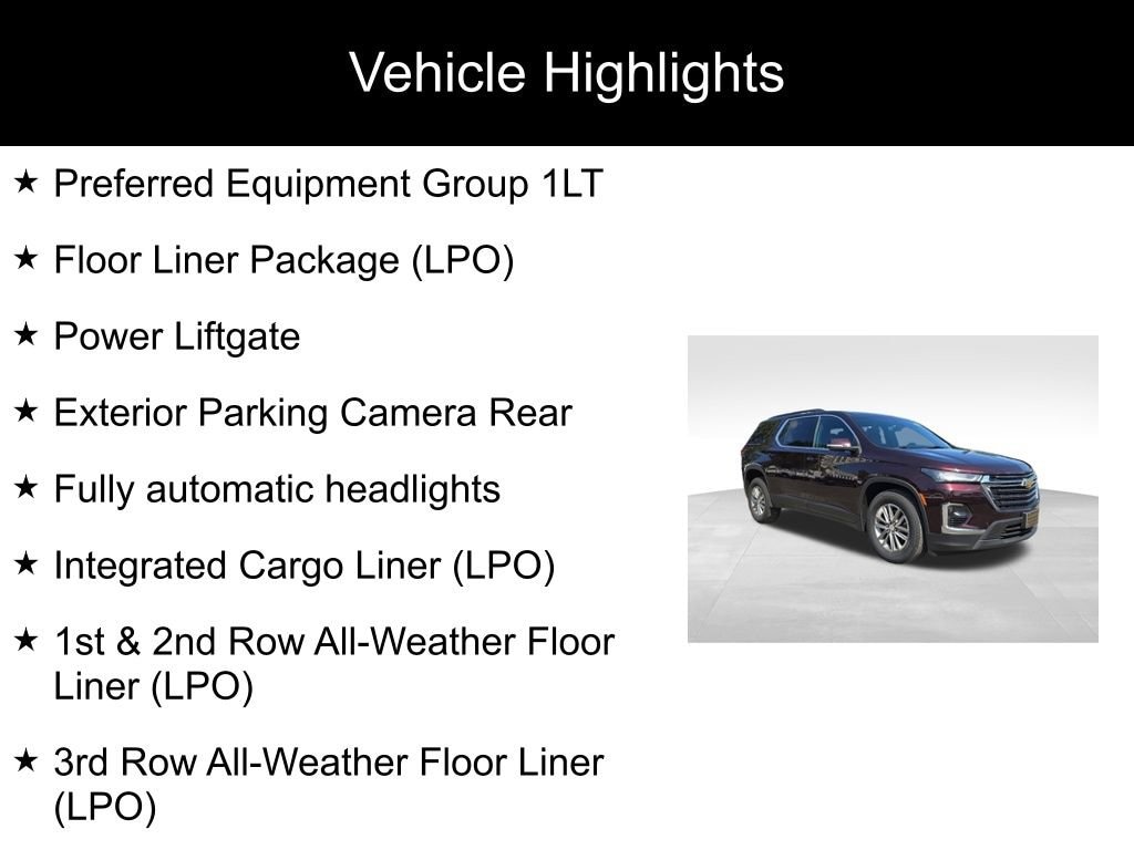 Traverse LT 1LT, 4D Sport Utility, 3.6L V6 SIDI VVT, 9-Speed Automatic, AWD, Black Cherry Metallic, Jet Black Cloth, 1st & 2nd Row All-Weather Floor Liner (LPO), 3rd Row All-Weather Floor Liner (LPO), Apple CarPlay/Android Auto, Exterior Parking Camera Rear, Floor Liner Package (LPO), Fully automatic headlights, Heated Driver & Front Passenger Seats, Integrated Cargo Liner (LPO), Power Liftgate, Preferred Equipment Group 1LT.