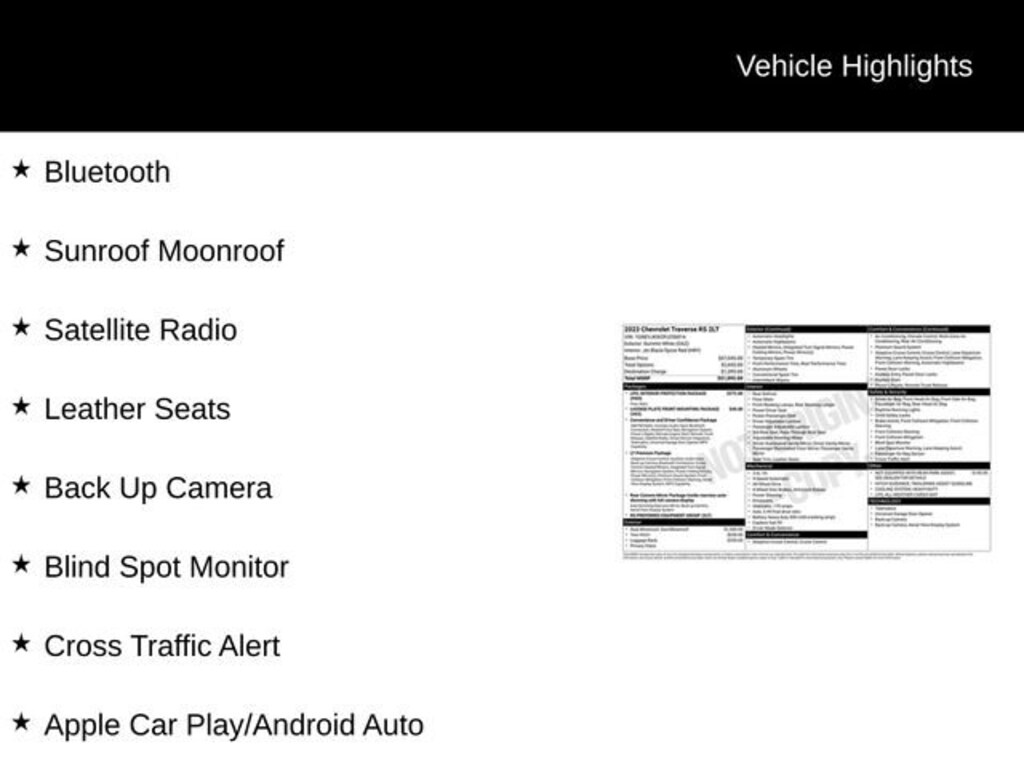 Discover the exceptional 2023 Chevrolet Traverse RS, a versatile and well-equipped SUV that seamlessly blends style, performance, and cutting-edge technology. This stunning vehicle is the perfect companion for your adventures, whether you're embarking on a family road trip, navigating the urban landscape, or tackling the great outdoors.Boasting a sleek and modern exterior in a striking White color, the Traverse RS commands attention wherever it goes. Under the hood, the powerful 3.6L V6 SIDI VVT engine, paired with a 9-Speed Automatic transmission and All-Wheel Drive, delivers an exhilarating driving experience with an impressive fuel efficiency of 17 city MPG and 25 highway MPG.- Apple CarPlay/Android Auto- Back Up Camera- Blind Spot Monitor- Bluetooth- Cross Traffic Alert- Heated Seats- Leather Seats- Satellite Radio- Sunroof Moonroof- Dual SkyScape 2-Panel Power Sunroof- Trailering Equipment- Interior Protection Package (LPO)The Traverse RS is equipped with a wealth of premium features that elevate your driving experience. Indulge in the convenience of the Bose Premium 10-Speaker Audio System, the intuitive Chevrolet Infotainment 3 Plus System with Navigation, and the added safety of the Rear Parking Camera and Hitch Guidance with Hitch View. Stay connected and entertained with seamless integration of your smartphone via Apple CarPlay and Android Auto.Comfort and versatility are at the forefront of the Traverse RS design. Sink into the plush, perforated Leather-Appointed Seats, which are both heated and power-adjustable, ensuring a personalized driving position. The Dual-Zone Automatic Climate Control and Heated Steering Wheel provide year-round comfort, while the Split-Bench Third-Row Seating offers ample room for passengers and cargo.Safety is paramount in the Traverse RS, with features like Forward Collision Alert, Lane Keep Assist with Lane Departure Warning, and Automatic Emergency Braking keeping you and your loved ones secure on the road. The Blind Spot Monitor and Rear Cross-Traffic Alert further enhance your awareness, while the Trailering Equipment package provides the confidence to tow your toys with ease.Experience the exceptional 2023 Chevrolet Traverse RS and discover the perfect blend of style, performance, and technology. Visit our showroom today to take this remarkable SUV for a test drive and see how it can elevate your driving experience.