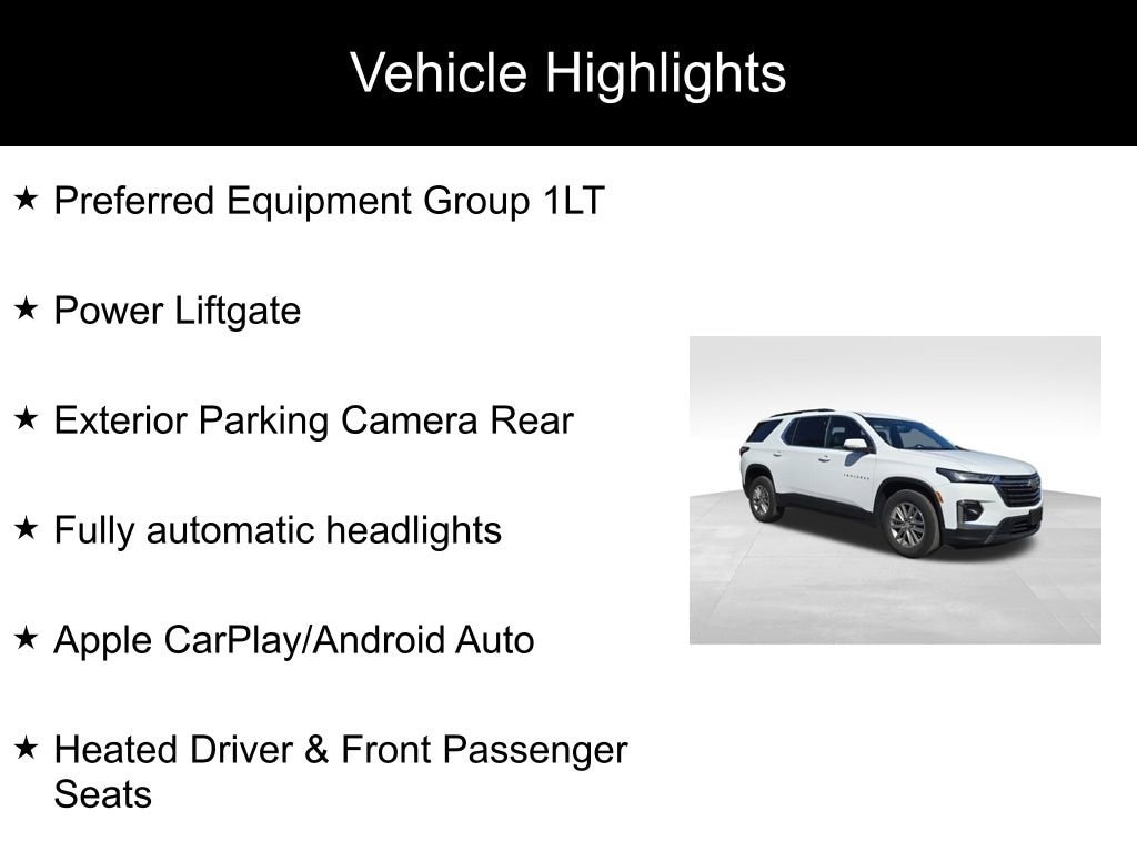 Traverse LT 1LT, 4D Sport Utility, 3.6L V6 SIDI VVT, 9-Speed Automatic, AWD, Summit White, Jet Black Cloth, Apple CarPlay/Android Auto, Exterior Parking Camera Rear, Fully automatic headlights, Heated Driver & Front Passenger Seats, Power Liftgate, Preferred Equipment Group 1LT.