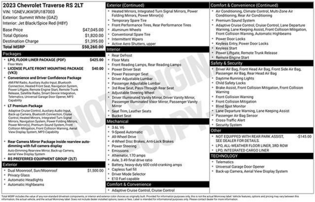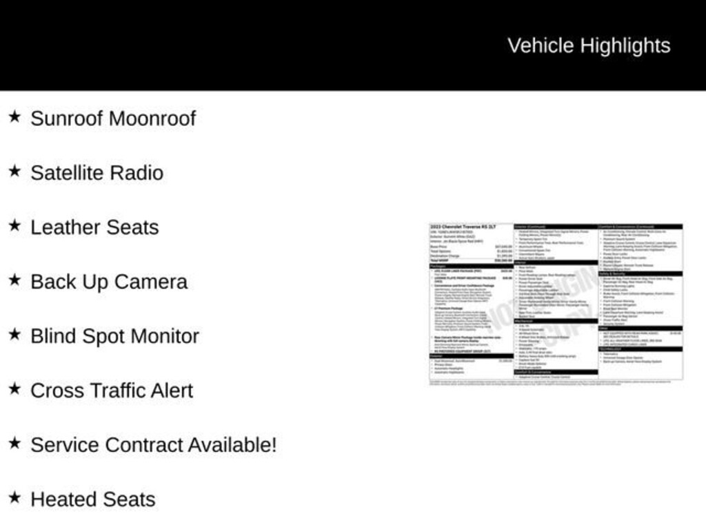 Sunroof Moonroof, Satellite Radio, Leather Seats, Back Up Camera, Blind Spot Monitor, Cross Traffic Alert, Service Contract Available!, Heated Seats, AWD, 4-Wheel Disc Brakes, 6-Way Power Front Passenger Seat, 8-Way Power Driver Seat Adjuster, ABS brakes, Apple CarPlay/Android Auto, Auto High-beam Headlights, Bose Premium 10-Speaker Audio System Feature, Dual SkyScape 2-Panel Power Sunroof, Electronic Stability Control, Exterior Parking Camera Rear, Four wheel independent suspension, Front dual zone A/C, Fully automatic headlights, Garage door transmitter, Heated Driver & Front Passenger Seats, Navigation System, Power driver seat, Power Liftgate, Power passenger seat, Preferred Equipment Group 2LT, Premium audio system: Chevrolet Infotainment 3 Plus, Radio: Chevrolet Infotainment 3 Plus System w/Navi, Rear air conditioning, Security system, SiriusXM w/360L, Wheels: 20 Dark Aluminum.
