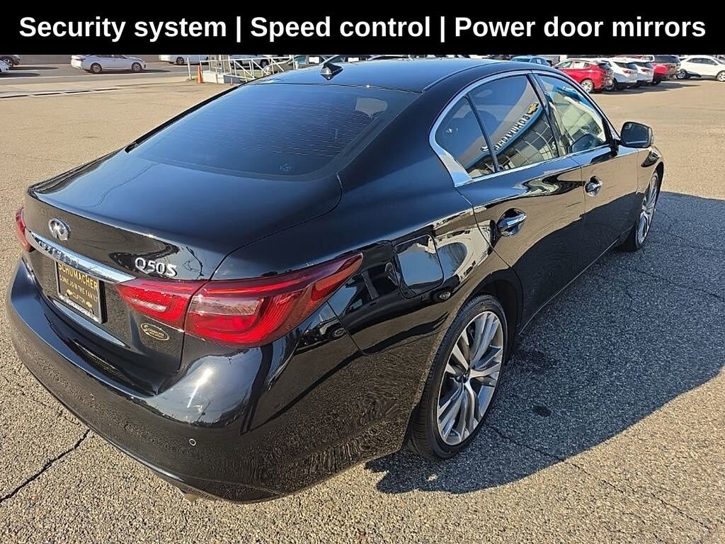 Schumacher Chevrolet of Clifton is very proud to offer this terrific-looking 2020 INFINITI Q50 Sport in Black Obsidian Beautifully equipped with 16 Speakers, Apple CarPlay/Android Auto, Automatic temperature control, Heated front seats, Navigation system: INFINITI InTouch Navigation, Power door mirrors, Power driver seat, Power moonroof, Power passenger seat, Radio: INFINITI InTouch w/Navigation, Remote keyless entry, Security system, Speed control, Steering wheel memory, Steering wheel mounted audio controls, Wheels: 19 x 8.5 Aluminum-Alloy, 4-Wheel Disc Brakes, ABS brakes, Adaptive suspension, Air Conditioning, Alloy wheels, AM/FM radio: SiriusXM, Auto tilt-away steering wheel, Auto-dimming door mirrors, Auto-dimming Rear-View mirror, Blind Spot Warning, Brake assist, Bumpers: body-color, CD player, Compass, Delay-off headlights, Driver door bin, Driver vanity mirror, Dual front impact airbags, Dual front side impact airbags, Electronic Stability Control, Emergency communication system: INFINITI Connection, Four wheel independent suspension, Front anti-roll bar, Front Bucket Seats, Front Center Armrest, Front dual zone A/C, Front fog lights, Front reading lights, Fully automatic headlights, Garage door transmitter: HomeLink, Heated door mirrors, Heated Front Sport Seats, Heated steering wheel, Illuminated entry, Leather Shift Knob, Leather steering wheel, Leather-Appointed Seating Surfaces, Literature Kit, Low tire pressure warning, Memory seat, Occupant sensing airbag, Outside temperature display, Overhead airbag, Overhead console, Panic alarm, Passenger door bin, Passenger vanity mirror, Power steering, Power windows, Radio data system, Rain sensing wipers, Rear anti-roll bar, Rear reading lights, Rear seat center armrest, Rear window defroster, Speed-Sensitive Wipers, Split folding rear seat, Tachometer, Telescoping steering wheel, Tilt steering wheel, Traction control, Trip computer, Turn signal indicator mirrors, and Variably intermittent wipers!